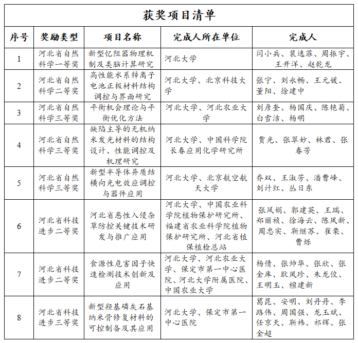 会议对获得2024年度河北科学技术奖的代表进行了表彰。河北大学共获2024年度河北省科学技术奖8项,其中一等奖1项、二等奖3项、三等奖4项,自然科学一等奖为我校“十四五”以来首次获得。