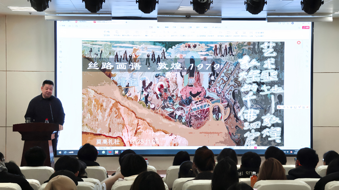 梁爽教授以“丝路画语·敦煌1979”为主题,展开融汇艺术与文化的深度阐释。他以敦煌艺术千年发展历程为脉络,讲解了壁画中线条、色彩、构图的演变轨迹,揭示其作为中华文明精神符号与丝路文化交融载体的独特价值,深入剖析了敦煌艺术在改革开放初期对艺术创作观念变革的启发意义。他特别强调,在全球化语境下,深入挖掘敦煌艺术的语言体系与文化基因,通过数字技术、沉浸式展览等现代传播手段,能有效为文化遗产的活化传承与跨文化对话开辟新路径。