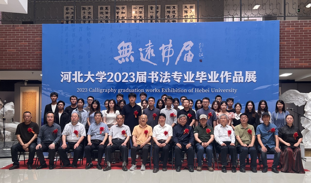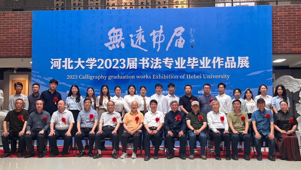 5月28日,“无远弗届——河北大学2023届书法专业毕业作品展”开幕式在艺术学院北展厅举行。活动由教务处、艺术学院主办。参加开幕式的领导嘉宾有:河北大学党委常委、副校长申世刚,中国书法家协会第七届副主席、河北省书法家协会主席刘金凯,国务院学位委员会艺术学科评议组成员、国家艺术学科教学指导委员会副主任兼戏剧影视广播委员会主任、北京师范大学教授周星,中国书法家协会理事、学术委员会副主任李一,廊坊师范学院党委副书记、校长杨学新,中国书法家协会理事、国家一级美术师王志安,中国书法家协会理事、河北省书法家协会副主席、保定市书协主席吴占良,中国书法家协会理事、华北电力大学教授仇必鳌,河北大学教务处处长张锋,中国书法家协会理事、河北省书法家协会副主席、河北大学艺术学院院长刘宗超;以及艺术学院书法专业教师、书法专业本硕博学生百余人参加开幕式。开幕式由艺术学院副院长李文岗主持。