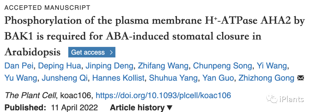 4月11日,Plant Cell 在线发表了中国农业大学/河北大学巩志忠教授等团队题为“Phosphorylation of the plasma membrane H+-ATPase AHA2 by BAK1 is required for ABA-induced stomatal closure in Arabidopsis”的研究论文,揭示了质膜H+-ATPase AHA2参与干旱胁怕下ABA促进拟南芥气孔关闭的早期信号转导机制。