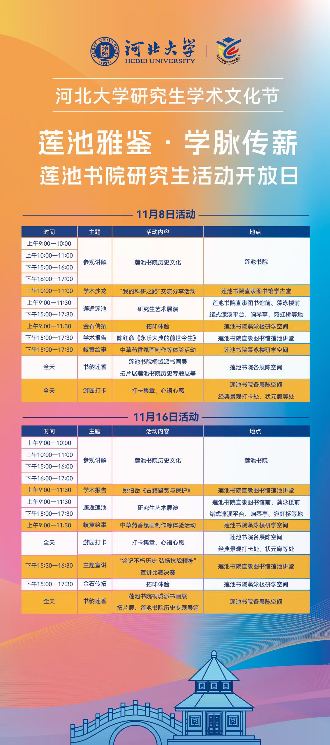 由党委研究生工作部和河北大学(莲池书院)人文高等研究生院共同举办的河北大学研究生学术文化节之“莲池雅鉴·学脉传薪”莲池书院研究生活动将在11月8日和11月16日面向我校研究生开放。