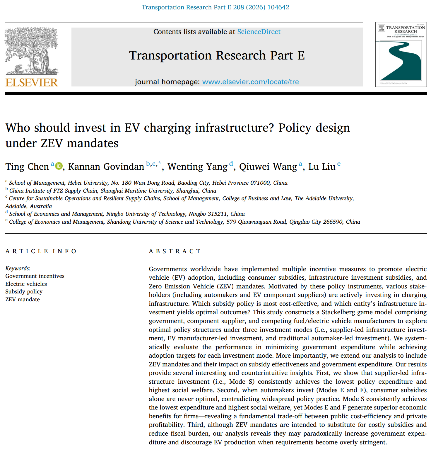 近日,我校管理学院陈婷副教授与澳大利亚阿德莱德大学商学院讲席教授Kannan Govindan在交通运输与运作管理领域国际权威期刊 《Transportation Research Part E: Logistics and Transportation Review》 上合作发表研究论文 “Who should invest in EV charging infrastructure? Policy design under ZEV mandates”,并已正式在线出版。Transportation Research Part E(TRE) 是交通运输、物流与运作管理领域的重要国际权威期刊,是国际ABS 3星、中科院 SSCI /SCI一区 Top 期刊,在交通运输与政策研究领域具有广泛而深远的影响。