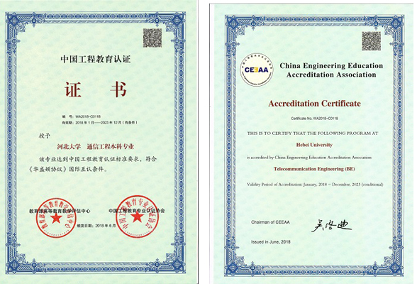 近日,教育部高等教育教学评估中心和中国工程教育专业认证委员会联合授予河北大学通信工程本科专业与自动化本科专业中国工程教育认证证书(见下图),上述两个专业达到中国工程教育认证标准要求,符合《华盛顿协议》国际互认条件,这标志着我校工程教育水平上升到了一个新的高度。