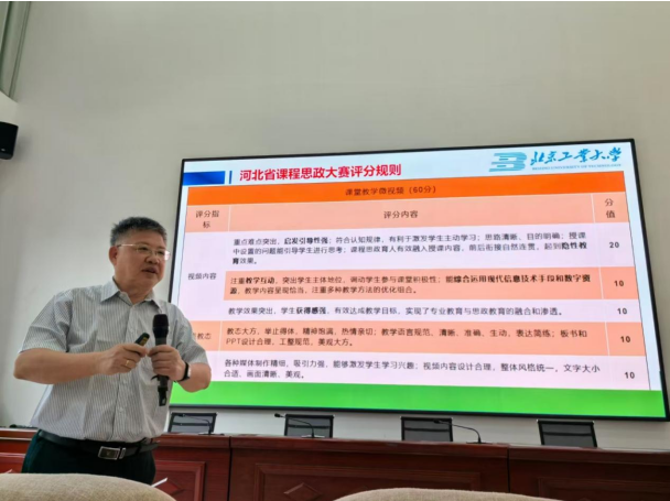 杨庆生教授以《基于课程思政的教学创新》为题,结合北京工业大学国家课程思政示范课程的建设经验,系统阐述了课程思政的建设理念、主要内容、实施路径和评价体系。杨教授强调,要注重课程思政与教学创新的有机融合,并以力学课程为例,深入剖析了专业知识体系与育人体系的辩证关系,通过典型案例展示了如何将思政元素自然融入专业教学,避免生硬植入。最后杨教授结合河北省课程思政大赛评审经历,分析大赛网评材料、现场说课、教学演示、陈述答辩等环节的共性问题,并给出意见建议。与会教师围绕课程思政效果评价、思政元素挖掘、教学实践应用等问题与杨教授进行了深入探讨。
